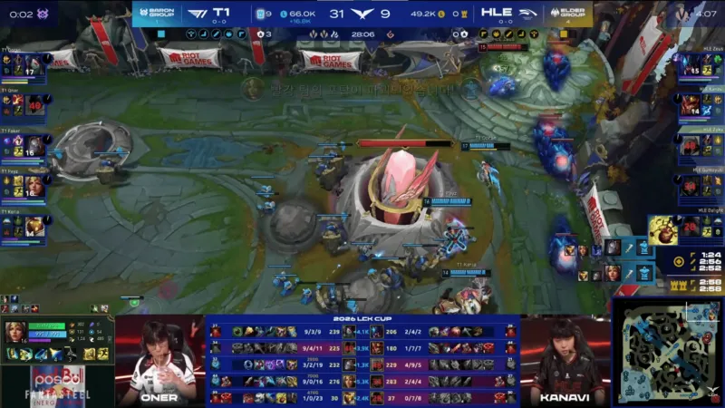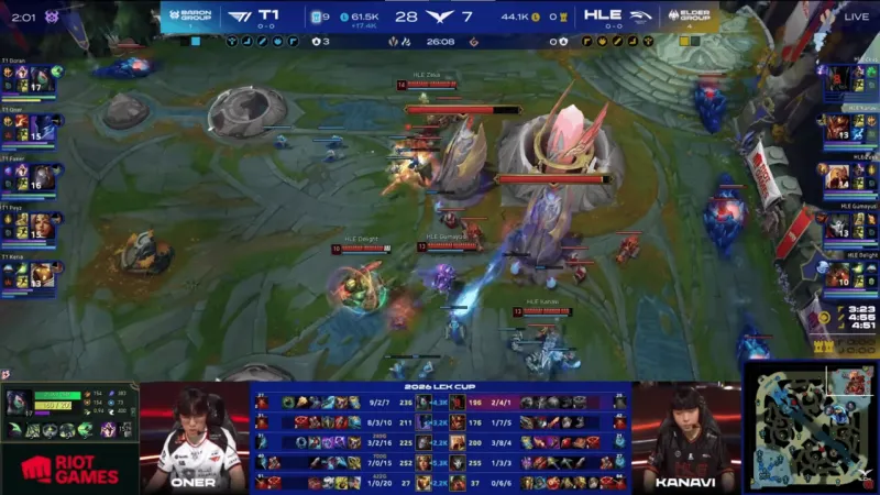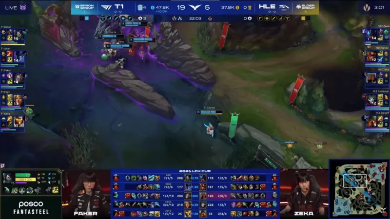 比赛第20分钟,Doran阿卡丽单杀Kanavi皇子,随后T1先后击杀HLE三人拿下大龙→