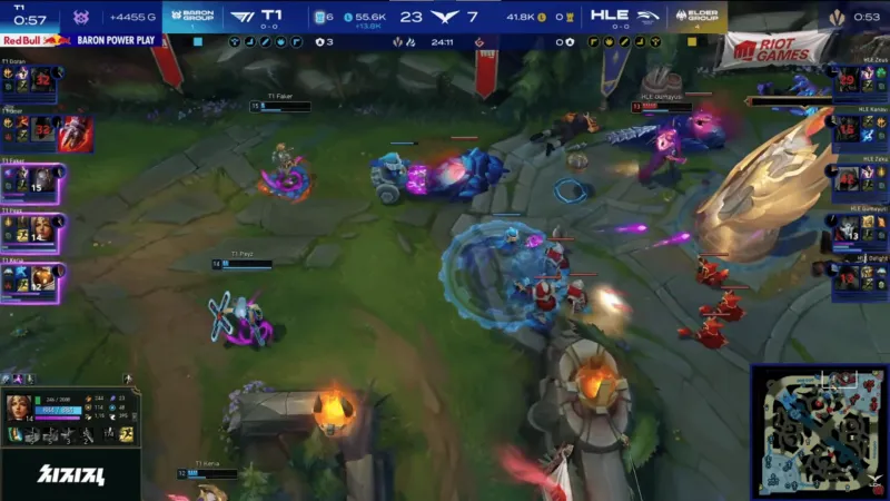 比赛第24分钟,T1带大龙Buff推进,随着Zeka沙皇残血追击被Peyz希维尔秒掉,T1先后打出2换4→