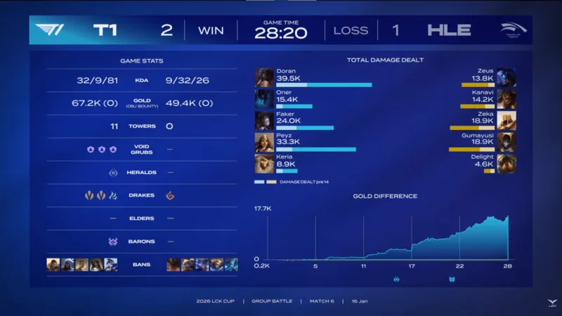 虎扑01月16日讯 【GAME3】T1蓝色方、HLE红色方